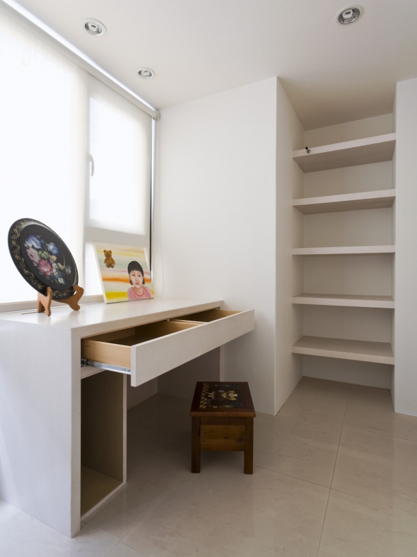 電視牆後方小巧的書房設計,窗前規劃閱讀桌,桌下還預留電腦主機的位置。