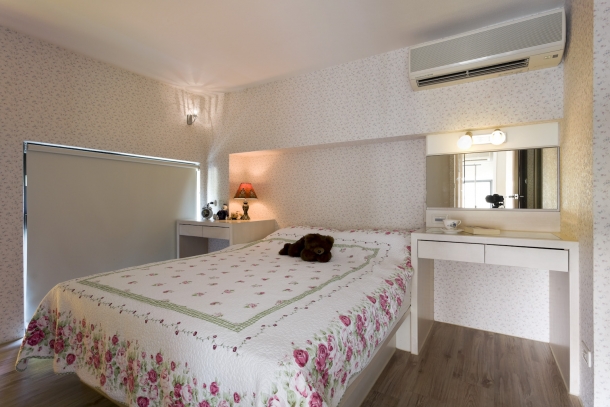 樓上主臥室內搭配柔美的碎花壁紙整合視覺,床鋪兩邊分別規劃閱讀區與梳妝區,地面滿鋪溫暖的木質地板,營造溫馨的休憩氣氛。