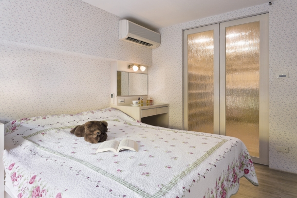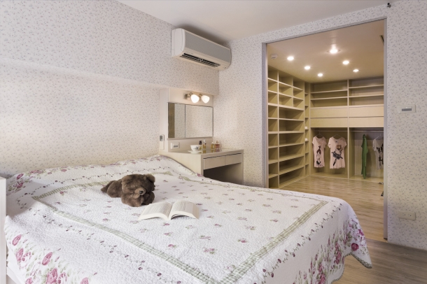 主臥室床側隔著輕盈的水波紋玻璃拉門安排更衣間,提供各種令人歎為觀止的收納巧思。
