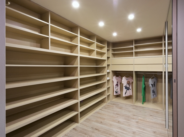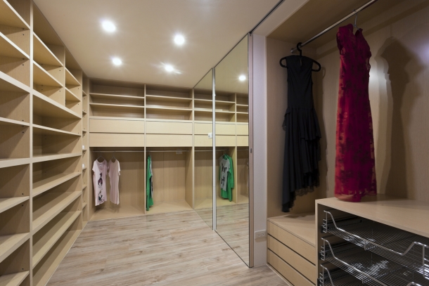 主臥室專屬更衣間內大部份櫥櫃以開架形態設置,儲放物品一目瞭然,另一面密閉櫃則以明鏡製作拉門,兼顧穿衣鏡機能。
