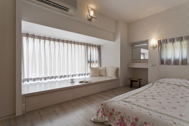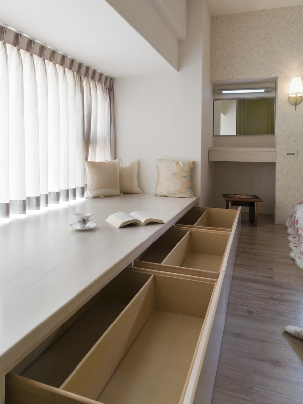 主臥室窗前的區塊雖然有上樑經過,不過規劃成坐臥兩用的休閒臥榻正合適,榻下還有實用拉抽。