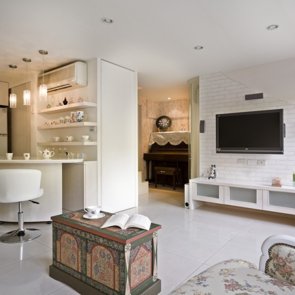 客廳電視牆同時也是牆後書房的隔間,正面使用倣白磚的壁紙修飾,斜切的線條則拉出細膩的立體層次,由儲藏室與電視櫃的夾角隱約可見後方的鋼琴區。