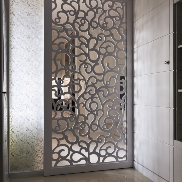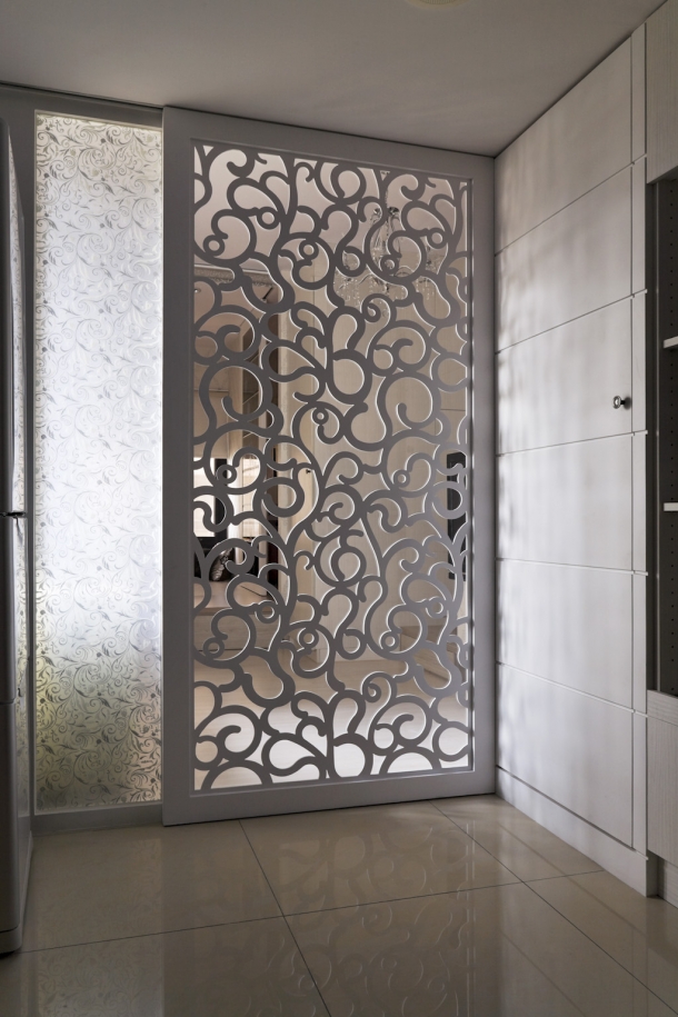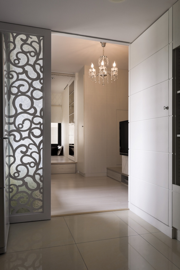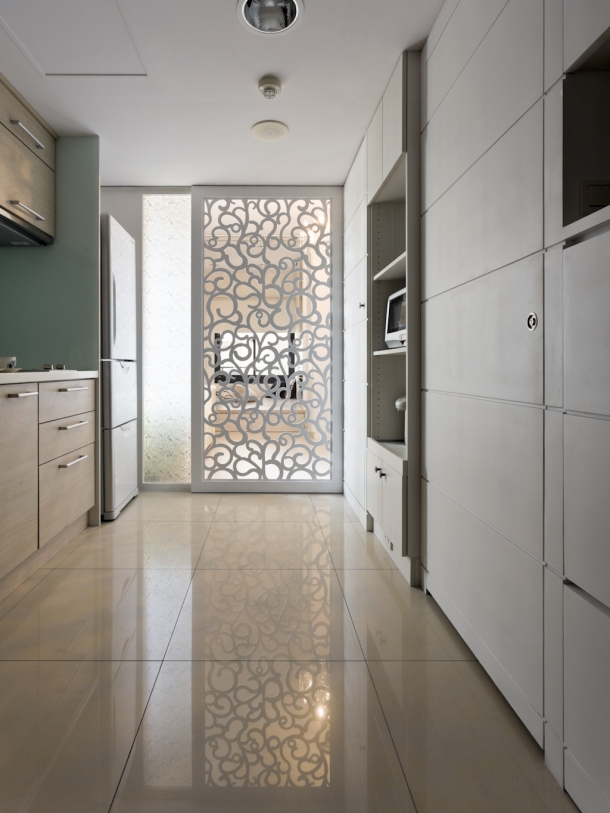 廚房浴室區隔著一扇精美造型拉門與後端的客廳等作息空間分野,雕花鏤空的拉門與棉紙玻璃隔間相輔相成,不僅營造絕佳的視覺穿透效果,也讓自然光線得以進入較暗的廚房區塊。