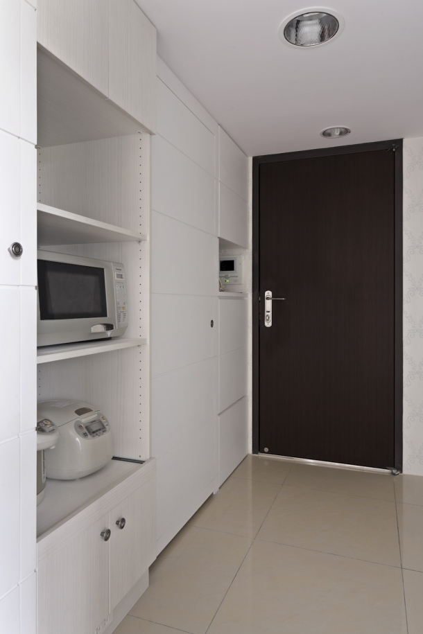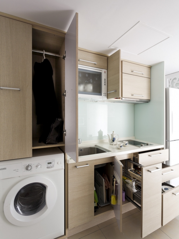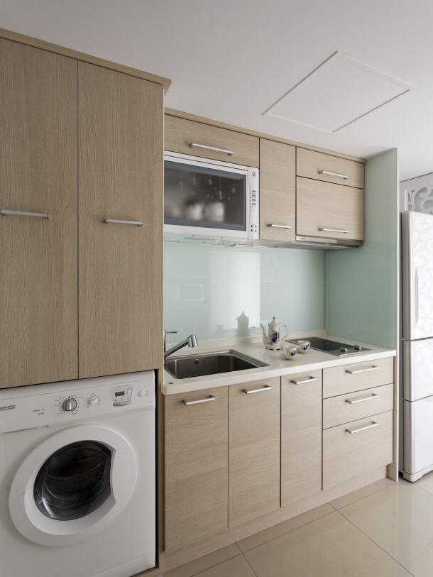 精緻小巧的輕食廚房強調實用性,左側高櫃除了洗衣機空間,上櫃的部份則作為衣帽櫃來使用。