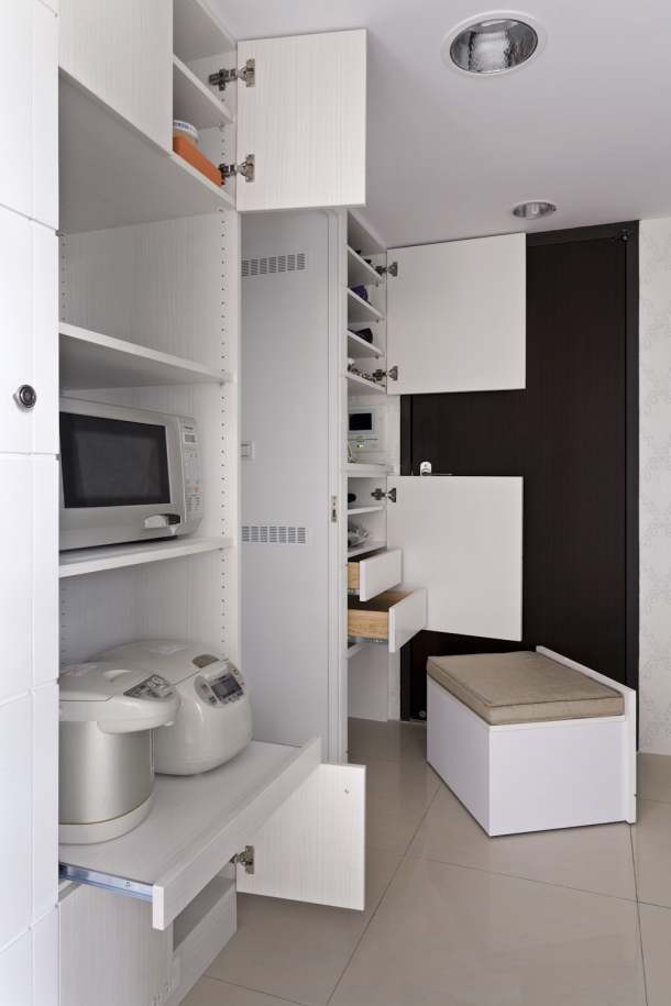 家電櫃左側的空間規劃為儲藏室,外觀是俐落的白色線條勾縫造型,巧妙化解櫥櫃的實體性。