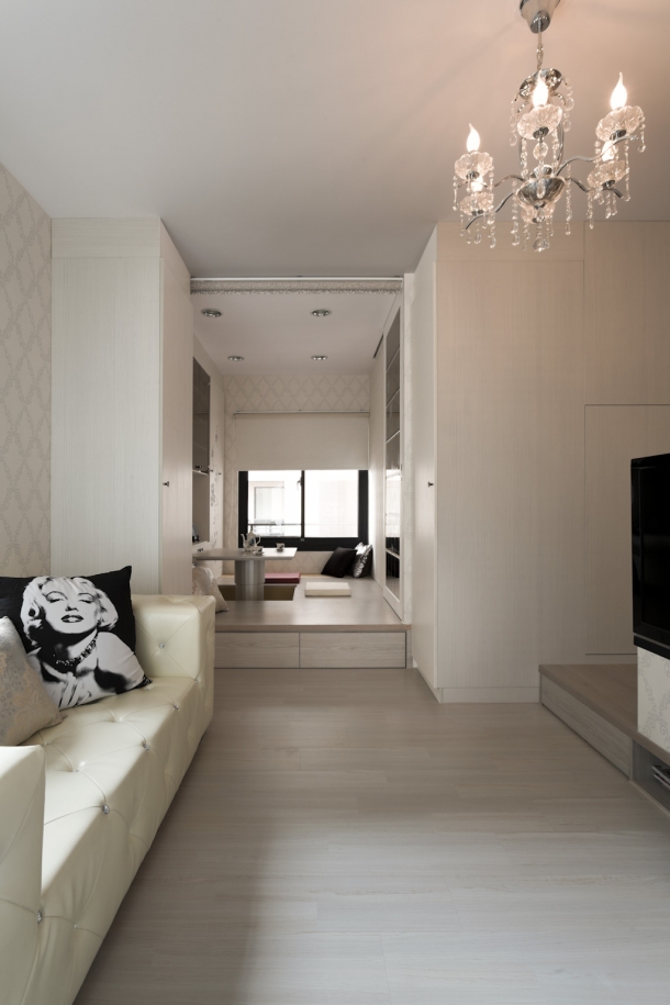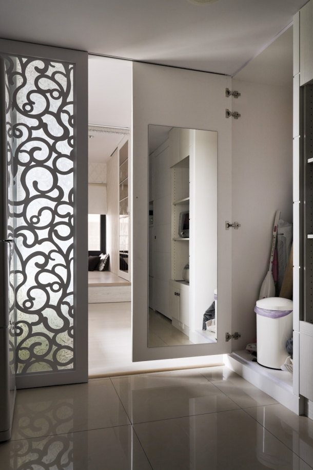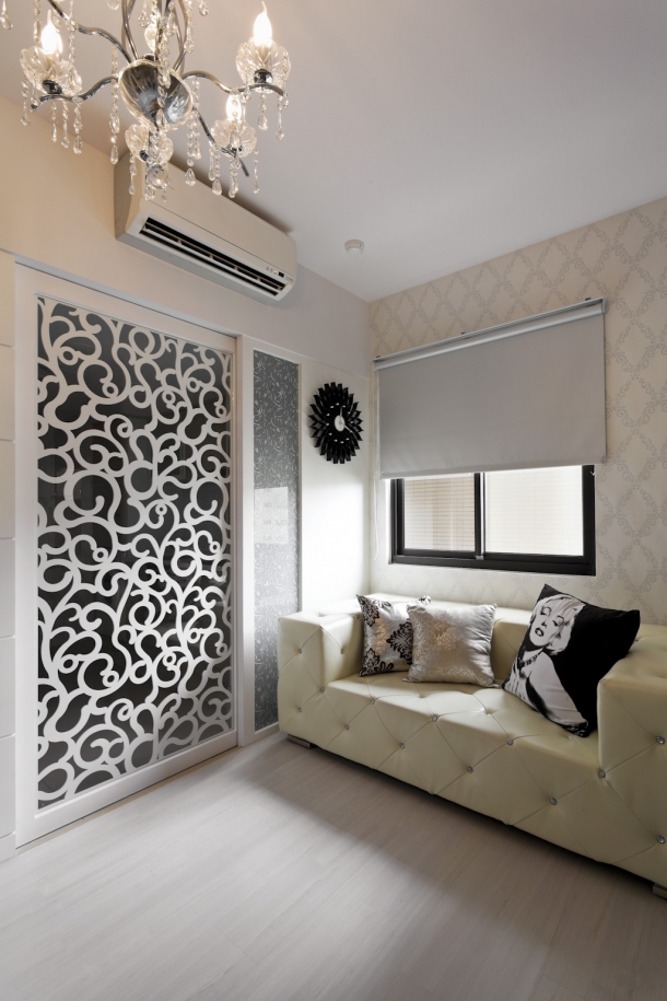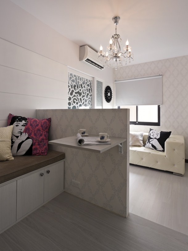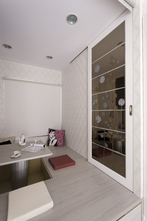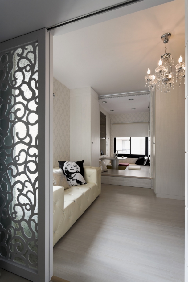 套房格局的產品一向是設計師的頭痛項目,一來空間小;什麼創意都不容易落實,二來還要考慮屋主所有生活必需機能,實際規劃起來並不容易,也因此更能對照出這件個案的精彩,僅僅12坪左右的長形空間,很幸運地擁有兩面採光,在一進門的廚房、浴室與中、後段客廳、和室、臥室之間,利用一道精美的雲紋雕花拉門劃分區域,打造井然有序的起居動線,也賦予設計更高的實用價值,讓屋主在忙碌的工作後,能輕鬆方便的在家生活。
