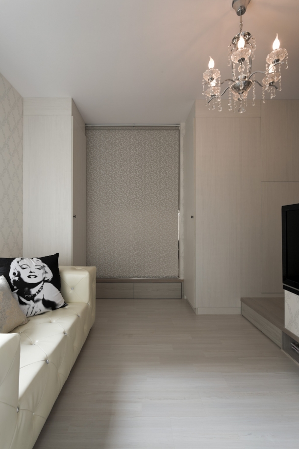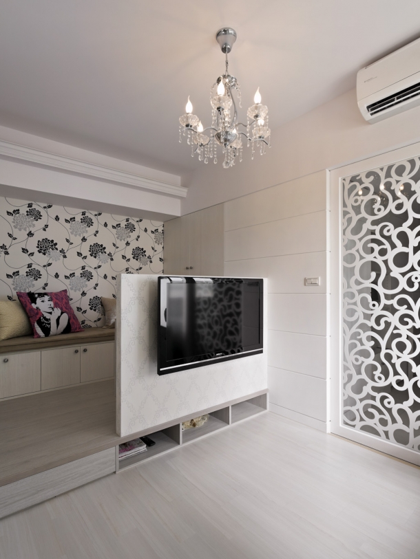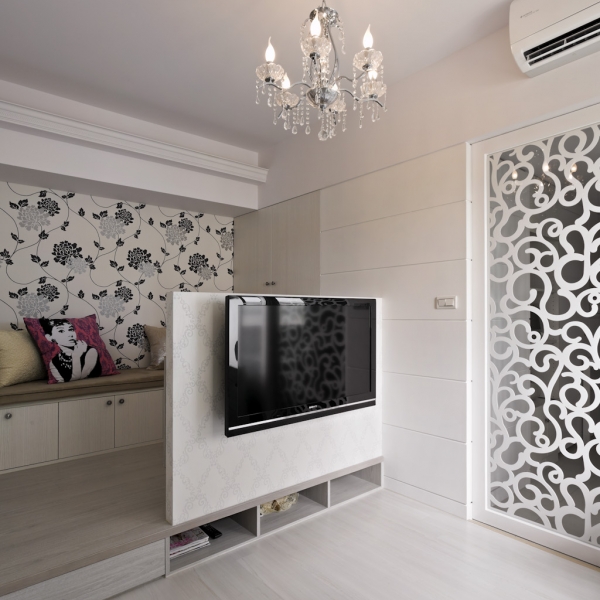 客廳輕薄的電視牆,同時也是牆後架高休閒區的隔間介質,地板下方順勢分割成為拉抽和機電櫃,牆面點綴壁紙美化視覺,並搭配軟榻豐富居家的休閒娛樂機能。