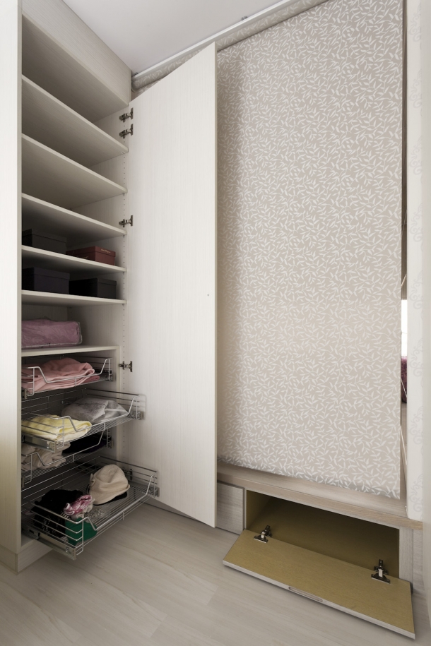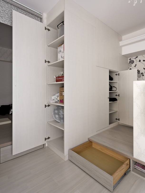 和室區前端地板下方安排下掀式收納空間,左側高櫃打開來分別是可調整高度的活動格櫃與五金拉藍,非常實用。