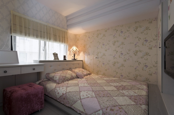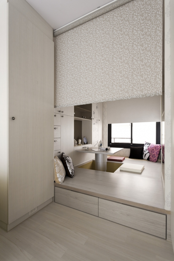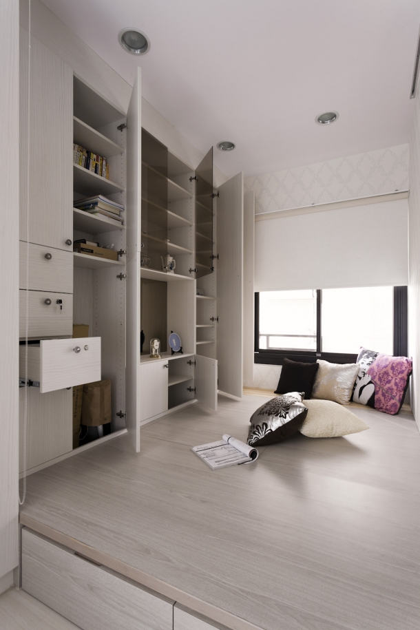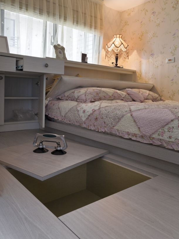 .臥室將床鋪直接鑲嵌於地板中,床頭飾版後方可做棉被櫃,床畔地板下方也有實用收納設計。