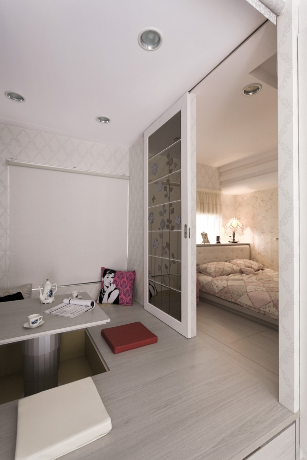和室同時也是進入臥室的前身,兩者之間利用瑰麗的茶鏡拉門隔開,滑動之間創造美麗的視覺焦點,也能維護彼此之間的隱私。