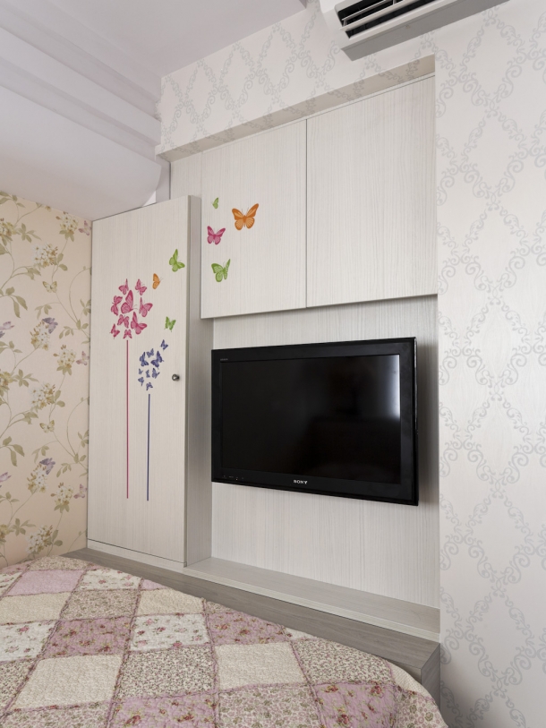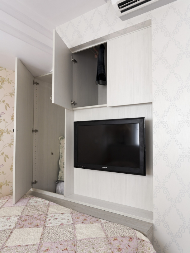 臥室床尾視聽牆與客廳休閒區共用隔間,電視上方與左側規劃精巧衣櫃,也是兩面共用的精彩巧思。