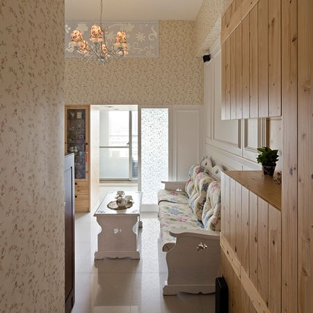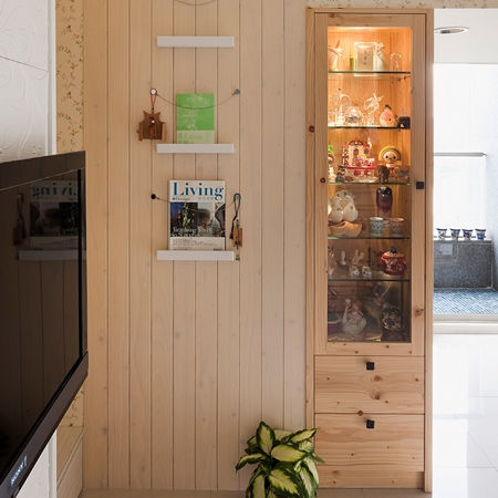 主要建材|杉木、壁紙、系統櫃、玻璃、木作噴漆、復古磚、雷射雕刻板