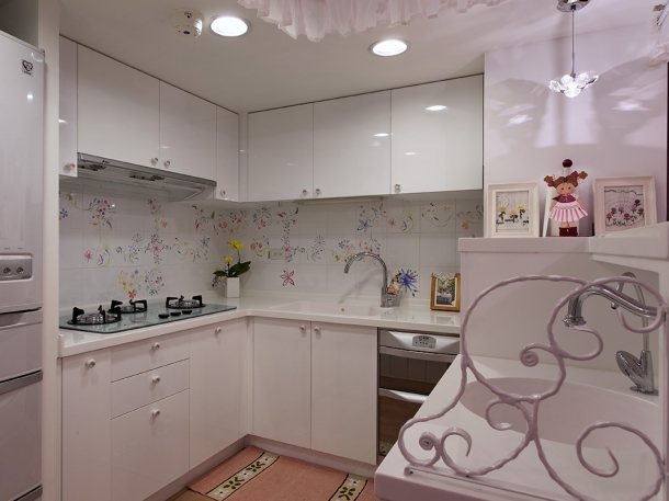 淨白雅緻的白色廚房兼具美感與強大機能,工作區牆面並採用唯美的花磚修飾,讓廚房不見生活的瑣碎,卻多了令人讚嘆的視覺美感。