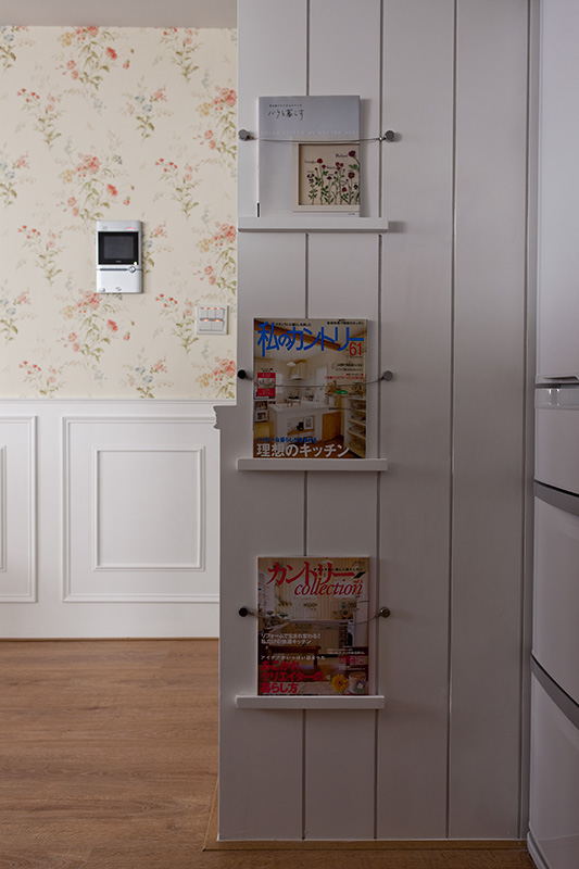 利用玄關屏風櫃後靠所特製的書報架,運用經典的格柵線條當作背景,搭配小巧層架與五金所創造的生活巧思,雖然只是整體規劃的一處細節,卻能為空間注入無限情趣。