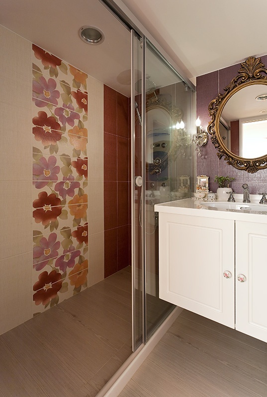 精美的浴室採機能乾溼分離,洗手檯點綴鎏金雕花框鏡,搭配水晶燭台壁燈更是浪漫破表,淋浴間內也以夢幻花磚錦上添花,讓人一進來就捨不得走出去。