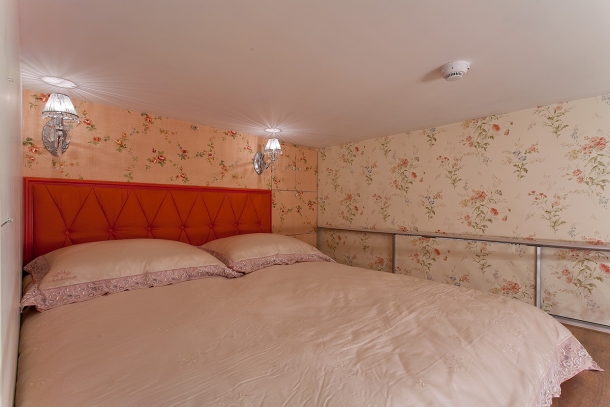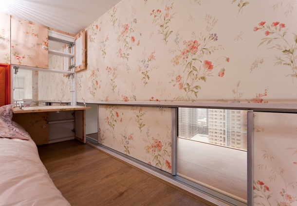 樓上被精緻花卉溫暖包圍的睡眠區,床畔有適度調整光線的採光窗,小巧梳妝台與床頭立面造型一氣呵成,精準利用每一寸空間。