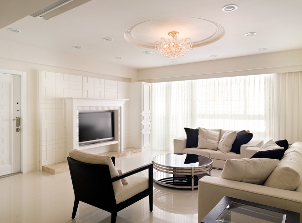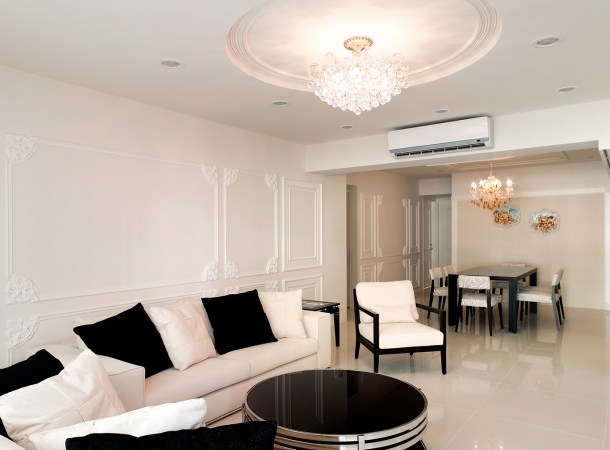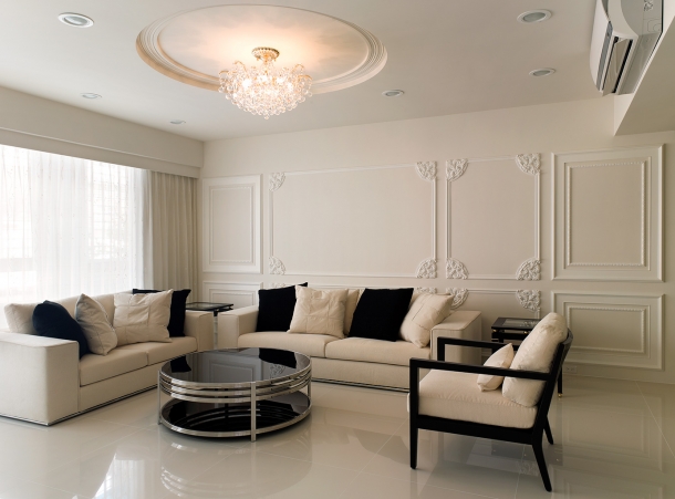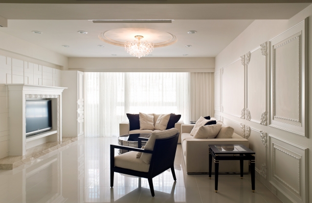 客廳因為充分採光與高雅的米白色調,洋溢著令人陶醉的迷人光感,沙發背牆以浮雕的線條語彙,烘托和諧的分割比例,並延續精緻的法式古典風情。