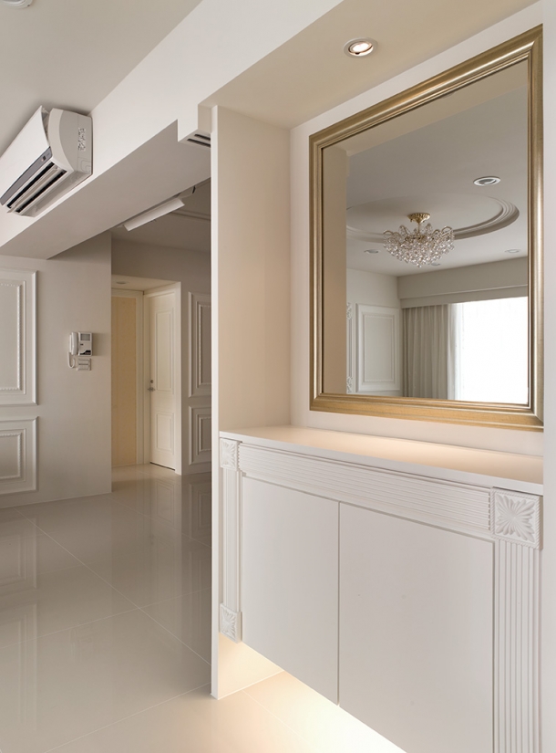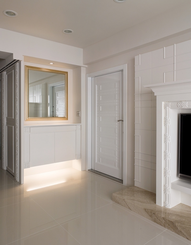 為了避免屋子裡過多的硬體櫥櫃佔據寶貴空間,我們特別利用廚房門邊精品櫃與玄關端景間的畸零區塊,細心規劃為隱藏式儲物間,入口處以以浮雕邊框修飾,看起來就像精美的牆面造型。