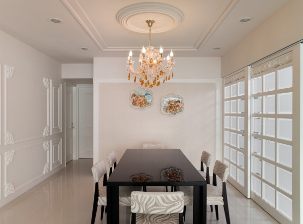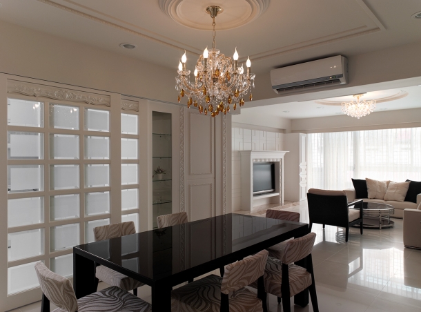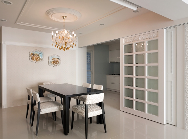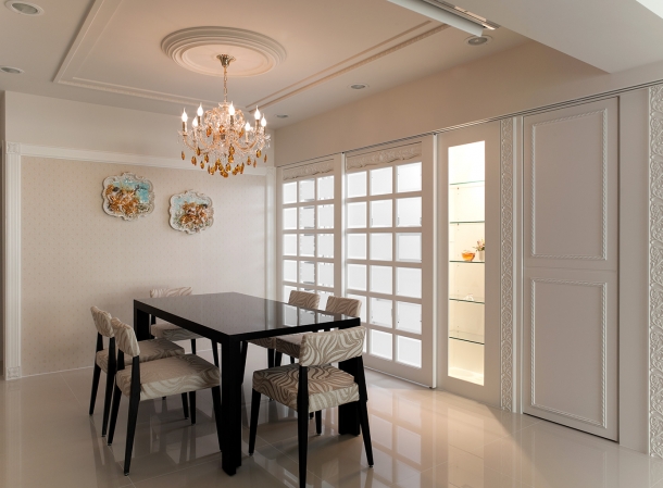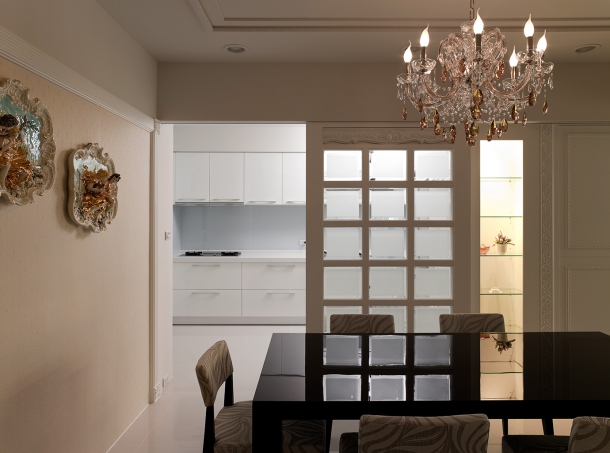 餐廳裡圓方線條共構的天花造型十分精緻,餐桌旁即是精巧廚房,用來區隔空間屬性的兩扇大型方格玻璃滑門,連接內嵌燈光的玻璃精品櫃,不僅具備視覺上的玲瓏光感,更是古典風格家居不可或缺的象徵性元素。