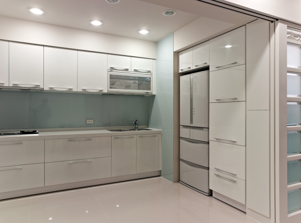 同樣以白為主題的廚房設計,一字形的工作區機能齊全,最特別的是鑲嵌於背景牆面的大面烤漆玻璃材質,為了追求日後易於維護與更完美的精緻度,採一整片無接縫工法處理,具體落實盡善盡美的細節堅持。