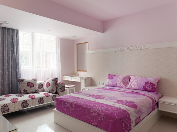 .以粉嫩色彩妝點的主臥室空間,床頭古典雕花飾版搭配高雅壁紙增添浪漫氣息,窗邊並貼心安排梳妝區與悠閒機能。