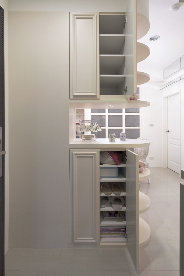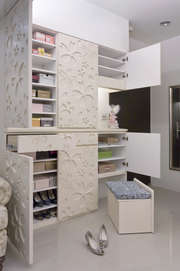 大門與客廳沙發之間的牆面規劃一座多功能收納櫃,櫃體門片以精緻的浮雕櫻花圖騰點綴,打開來則是多樣化的收納設計,並附加隱藏式穿鞋椅的貼心巧思。