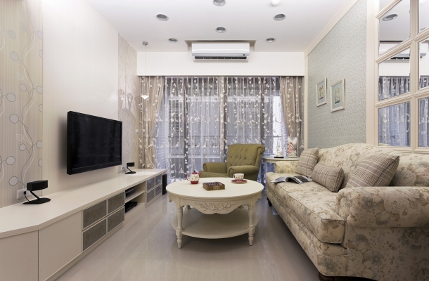 清新雅緻的客廳以米白基底,烘托牆面、傢具、紗簾上的細膩花卉圖案,乾淨卻又極具現代鄉村風情的畫面處理,讓生活就像一首詩般的愜意。