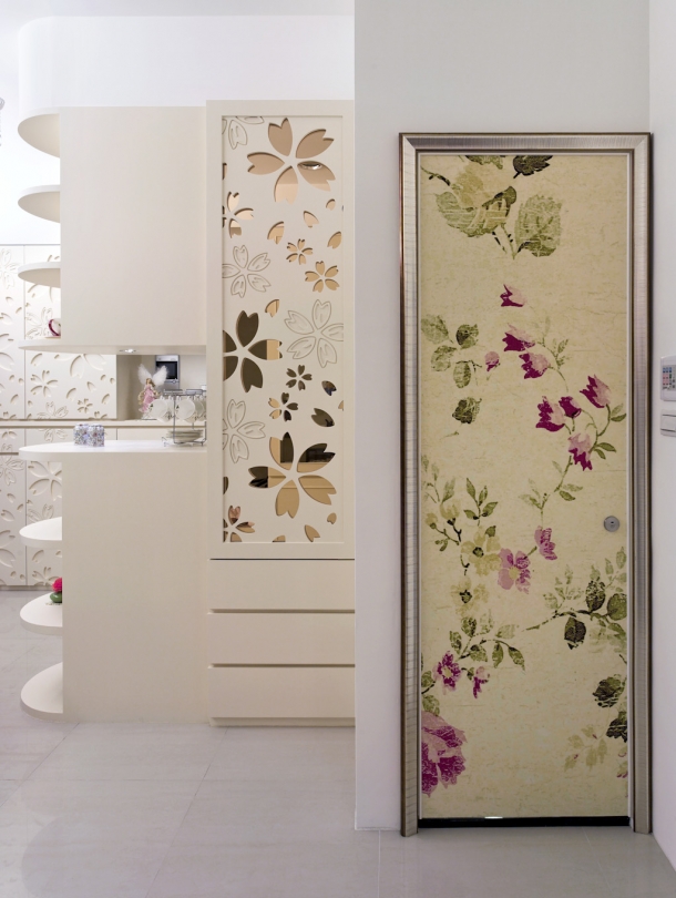 精緻浮雕的櫻花瓣,是公共空間內多處生活硬體共通的裝置語彙,除了豐富的自然感,更為家居增添不少浪漫情調。