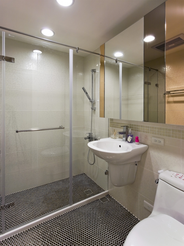 地面鋪設蜂巢型馬賽克,機能乾溼分離的客浴內部設計。