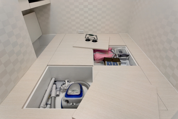小巧的和室搭配架高地板,地板下方都是分隔的收納空間。