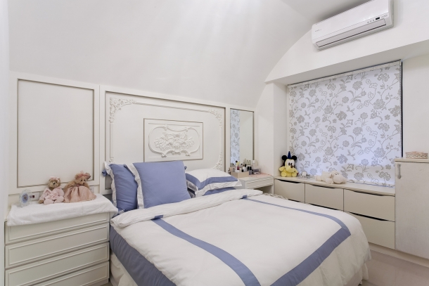 主臥室以兩邊對稱的分割造型美化床頭牆面,居中的浮雕圖騰既高雅又唯美,向上並以弧線收圓接續天花板的技巧,不著痕跡地解決壓樑的禁忌。