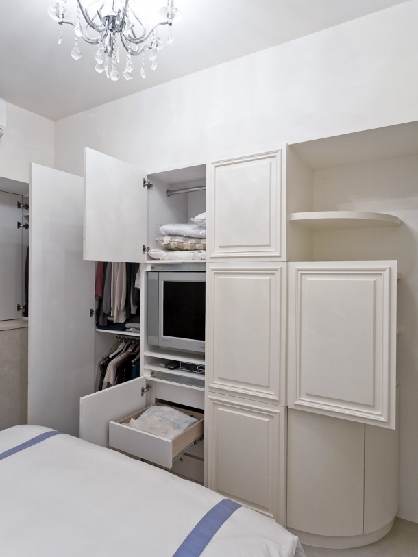 主臥室床尾視聽櫃非常別緻,關上時呈現俐落的方格造型,淡打開來卻擁有多樣化的生活機能,連開啟的方式也各不相同。