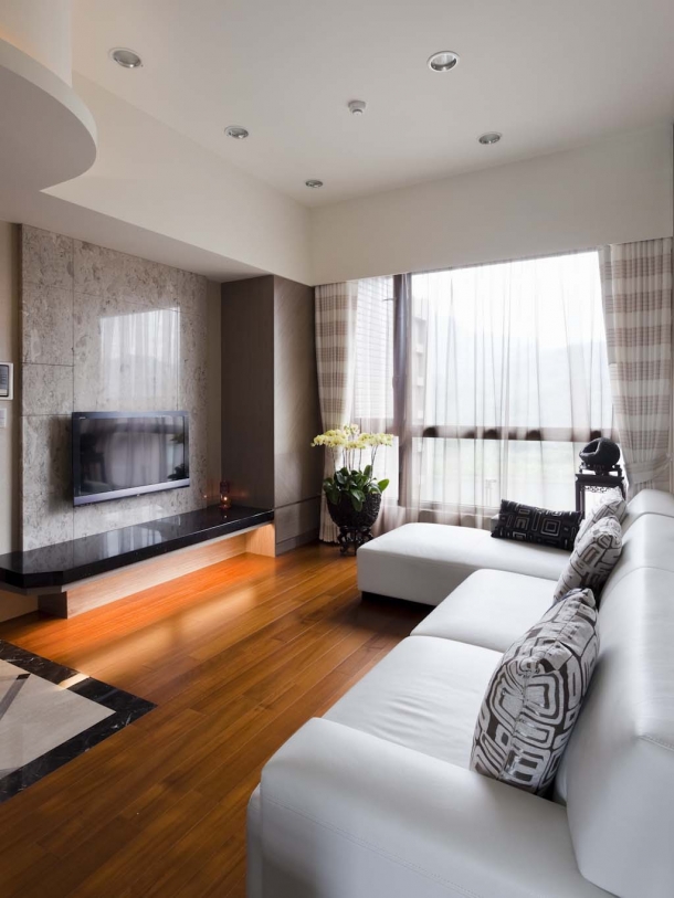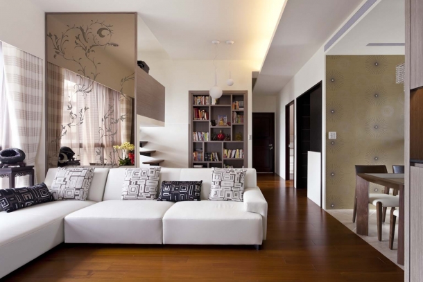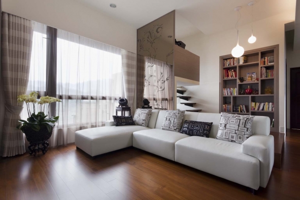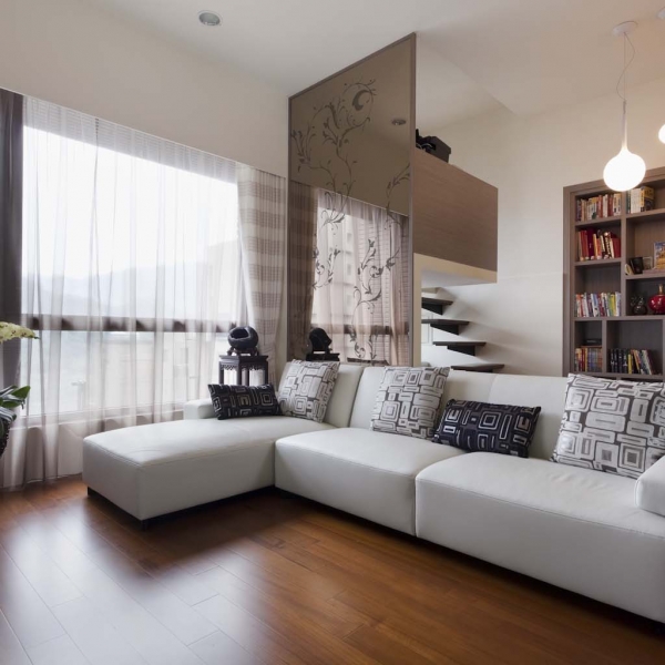 客廳發揮大面窗的採光優勢,白色皮革沙發後方以局部木地板架高,規劃成一方輔助客廳的多功能休閒區,包括嵌入牆面的大型分格書櫃兼展示櫃,角落靠窗處還配合一面圖案精緻的茶鏡噴砂隔屏,並融入局部夾層的技巧,創造單一地坪重疊使用的效益與趣味,特別是結構深入牆中加強支撐的輕巧踏階設計,兼顧現代美感與實用性。
