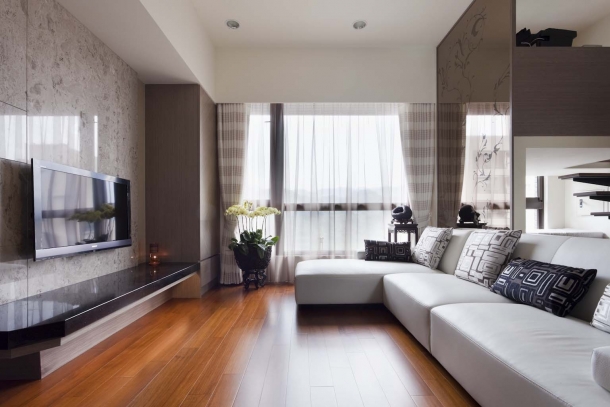清雅的客廳設計落落大方,簡潔的天花板設計顯出高度的充裕感,主牆將視聽、娛樂機能隱含於極簡的線性分割之中,而地面鋪設的木地板,則讓家更有溫暖歸屬感。