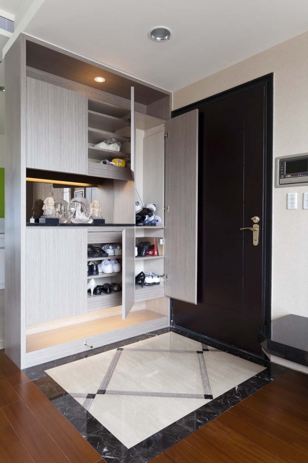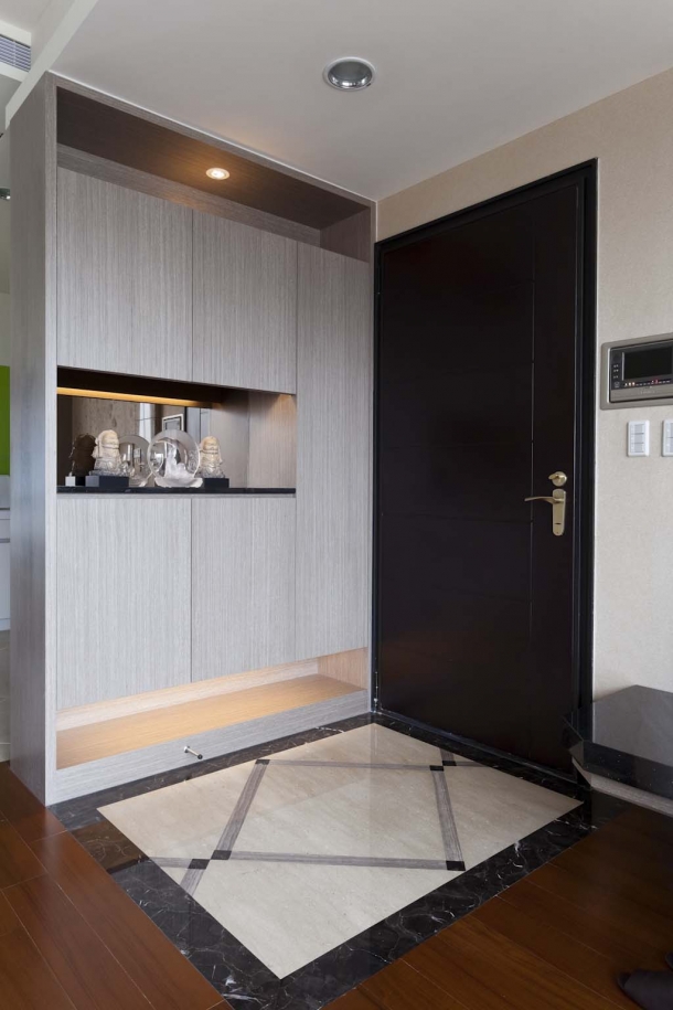 玄關區利用地面精美的方形石材拼花,配合上方別緻的天花造型以標示內外的區域感,大門旁規劃一座複合式收納高櫃,上中下分置重點燈光,增加造型的立體層次,內部打開來則是分門別類的收納設計。