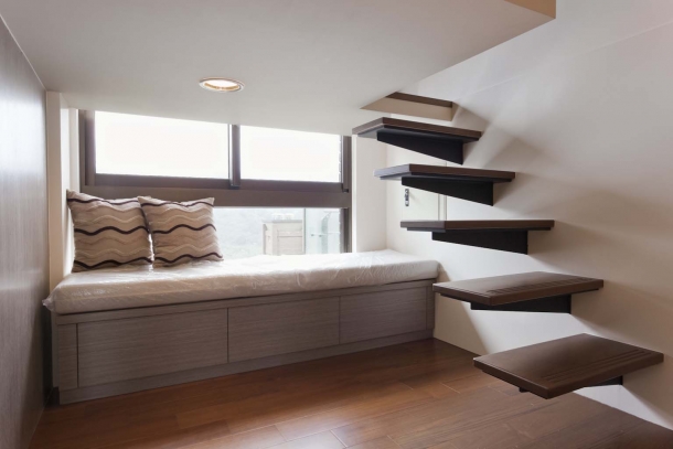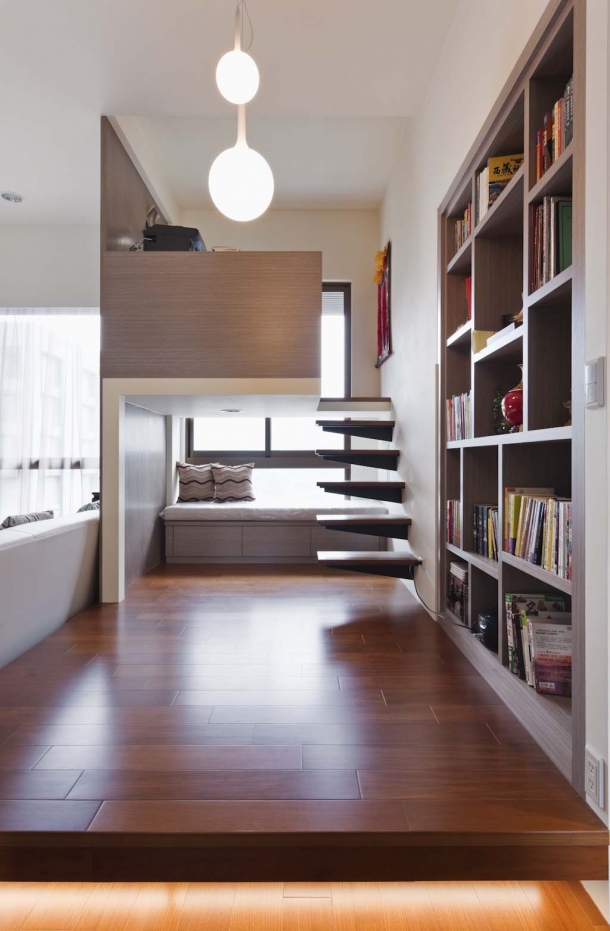 休閒區夾層下方安排附設拉抽的休閒臥榻,上方則可作為和室或個人電腦區來使用。