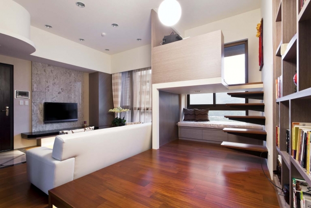 客廳沙發後方以木地板架高的休閒區域,在地板邊緣點綴燈帶,增加浪漫的光影層次,靠窗精緻的夾層區以輕盈梯階連絡上下。