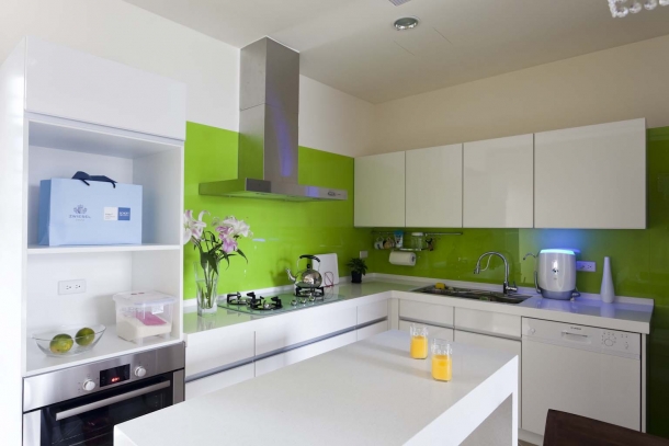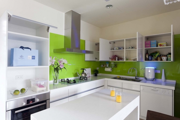 綠、白對比充滿生命力的餐廚區設計,L型的工作區搭配便利中島,不僅機能、收納、情趣百分百,賞心悅目的色彩配置也讓人心曠神怡。