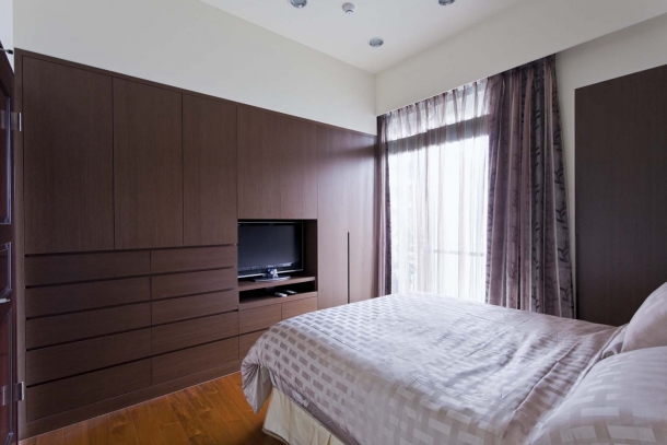 主臥室床尾安排大型衣物櫃,沈穩的木料色彩讓氣氛格外寧靜踏實,俐落的線條分割加上無把手設計,賦予內部多樣化的收納機能。