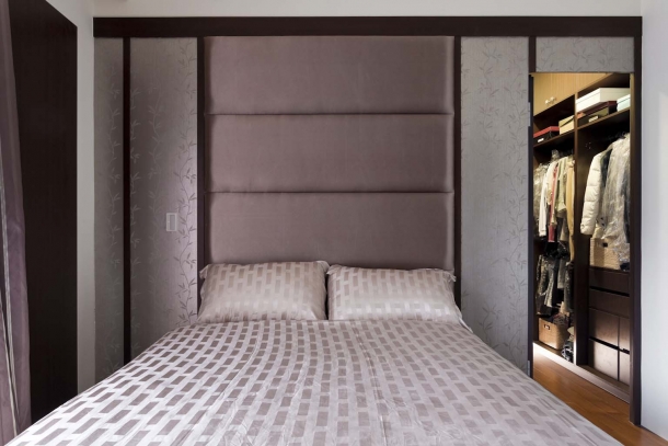主臥室床頭立面以柔軟的繃布造型為主體,兩側搭配銀色花紋壁紙,並將更衣室出入口隱藏於牆面造型間。