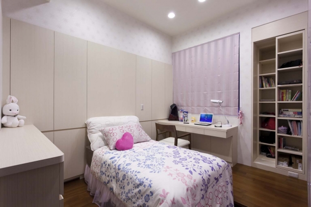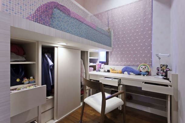 小孩房之一利用床頭牆面規劃大容量收納空間,窗前安排閱讀書桌,書桌旁並善用建物落差深度規劃雙層滑軌書櫃,增加實用效益。