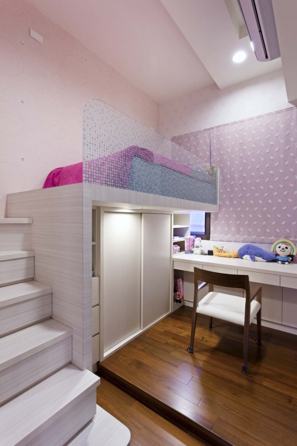 小孩房之二因為空間較小,因此透過高度來擴張空間效益,運用輕巧樓梯連結上方臥鋪與下方閱讀區,床座下方就能用來規劃衣櫃,另外以馬賽克貼紙點綴的玻璃扶手也十分美麗。