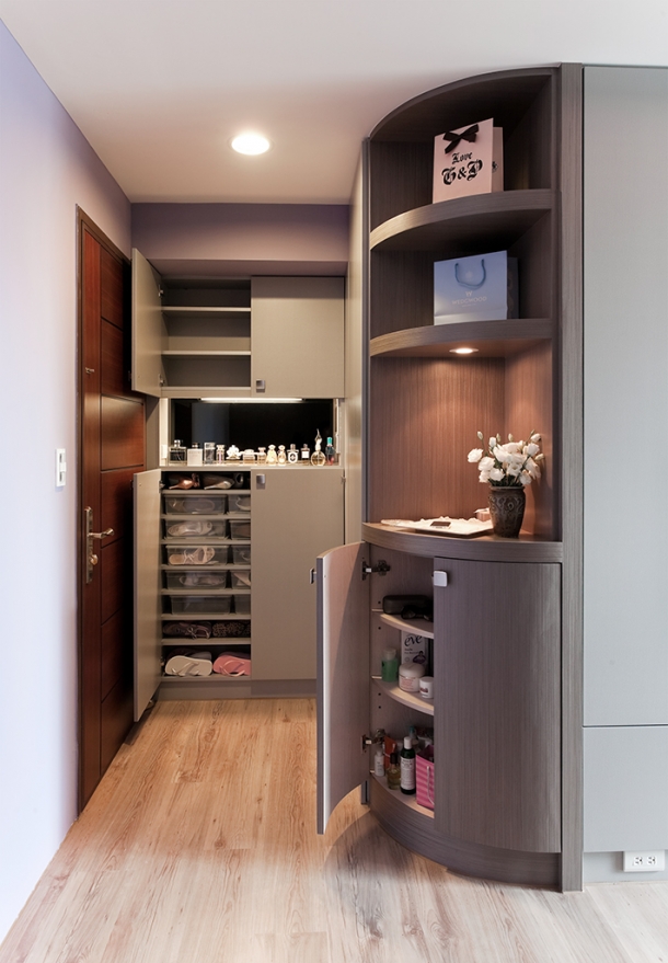 進門處利用L型銜接的收納高櫃,確定玄關的區域性,門後區塊善用樑下深度並搭配透明塑料收納盤儲放各種鞋款,櫃體腰段則是搭配燈光的小物放置兼展示區。