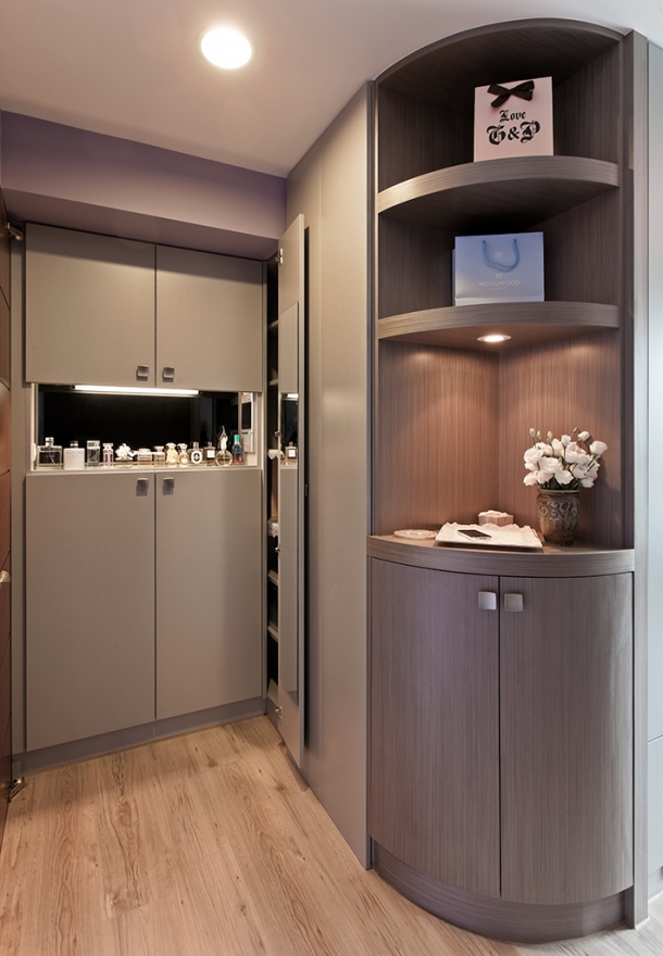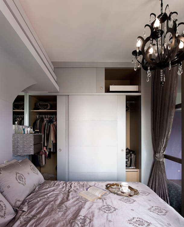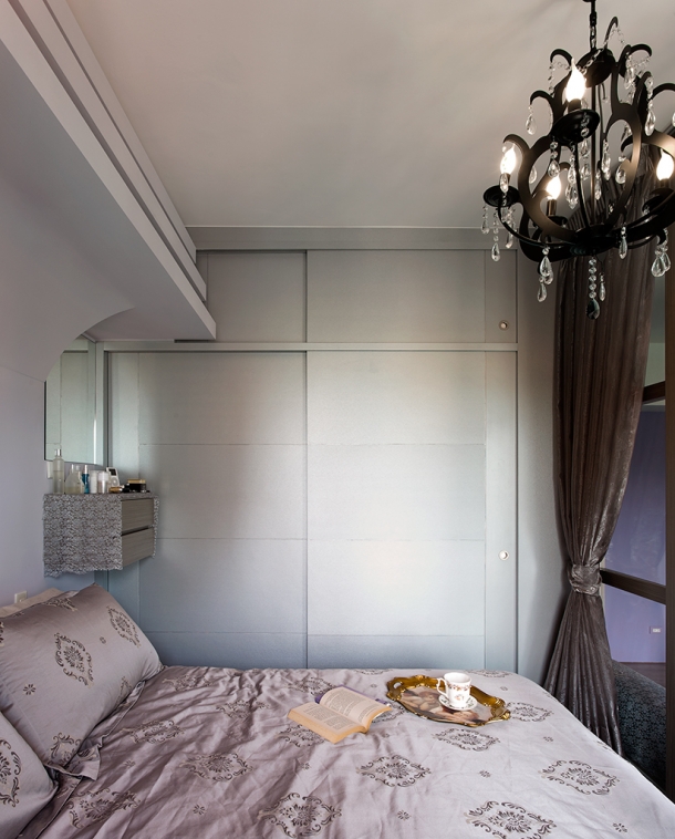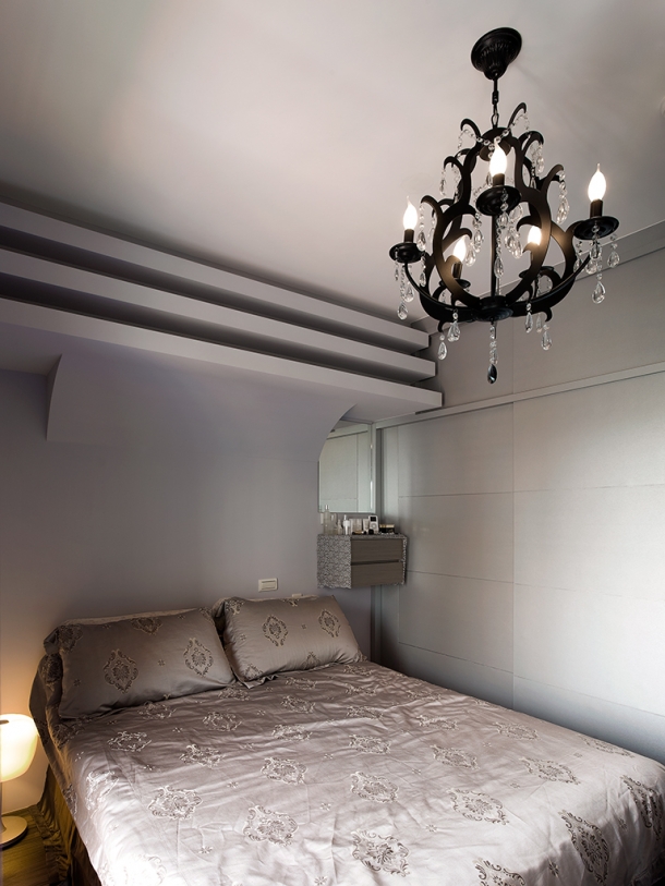 臥室床頭上方以三層的弧度線條巧妙消除壓樑的禁忌,床側則搭配主人站立的高度特製小巧梳妝區,設想十分體貼。