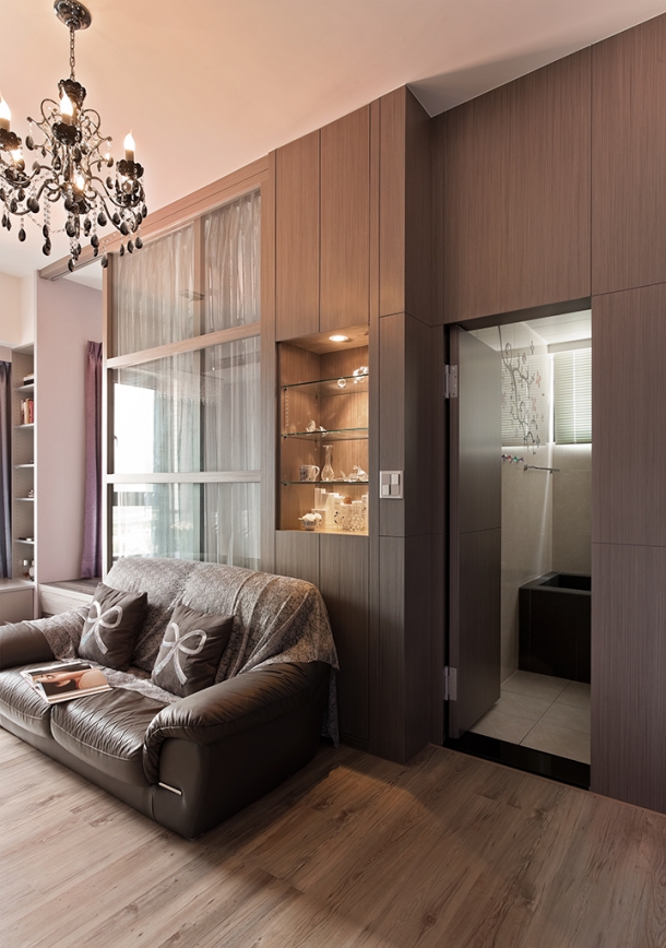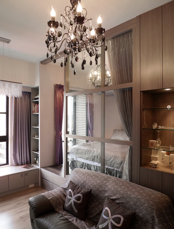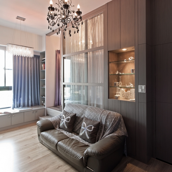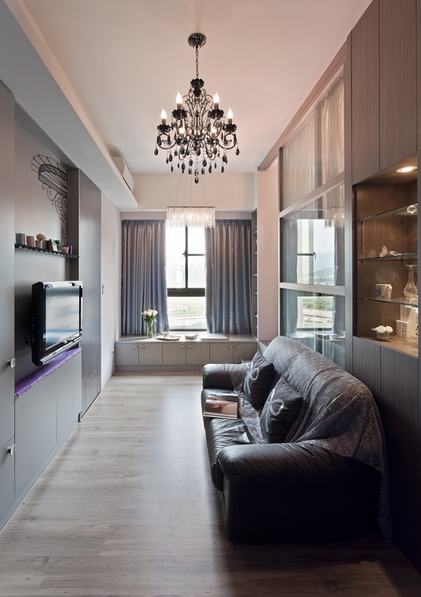 客廳為縱長形空間,雖然是單面採光,不過室內依然明亮,沙發後靠以內嵌式燈光精品櫃捕捉視覺焦點,相鄰的臥室玻璃隔間則讓視線維持穿透感,同時也善用窗下區塊,規劃休憩與充足的收納機能。