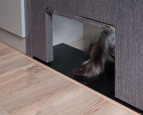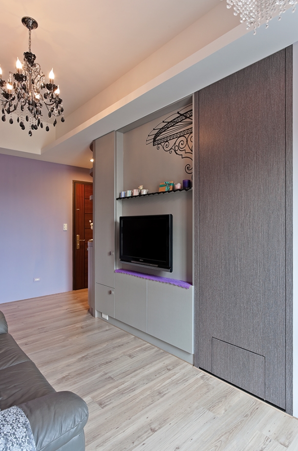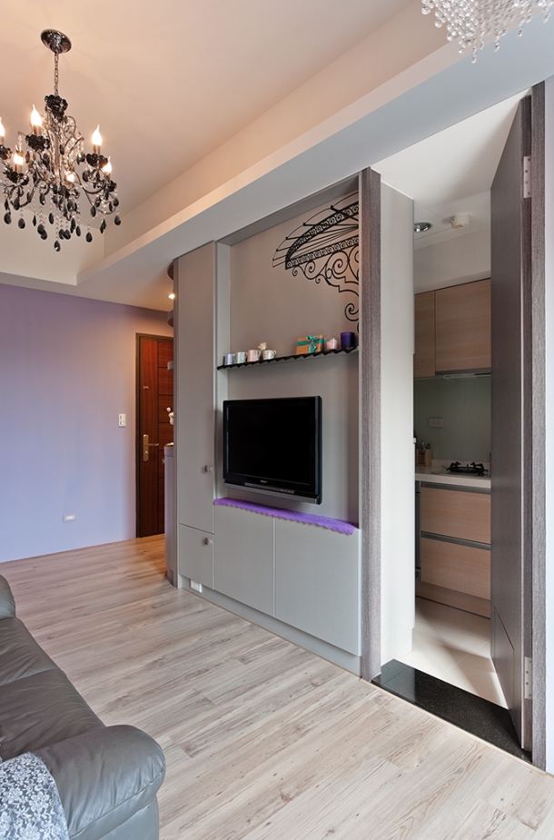 客廳主牆右側的深色立面,一方面讓整個主牆畫面更有層次,一方面也是廚房的出入口,我們還特地在門板下方多加一道開口,讓主人心愛的寵物也能自由進出。