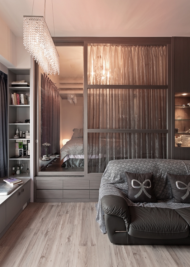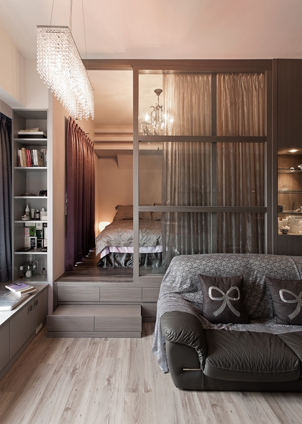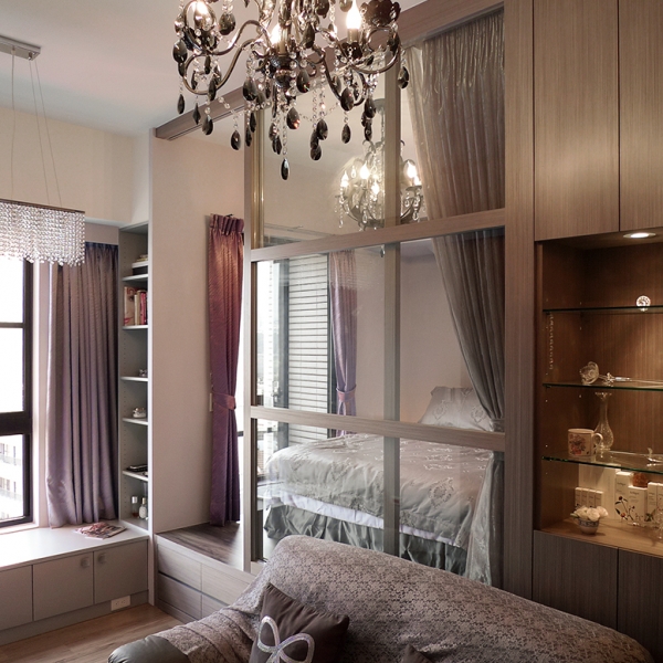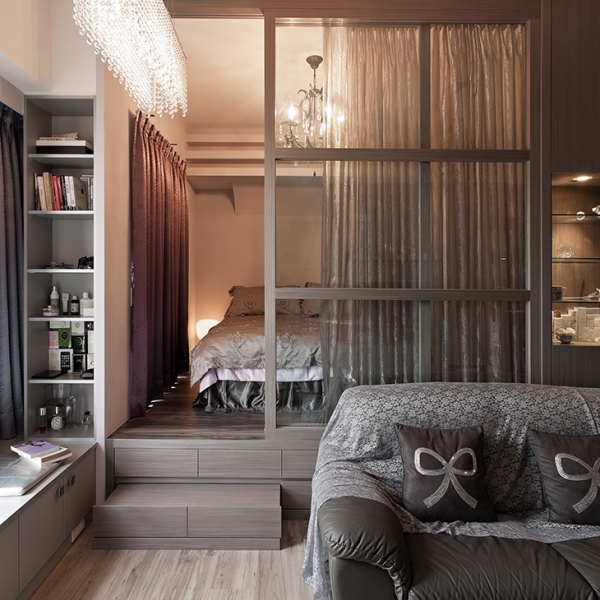 格子木作玻璃隔間後方即為地板架高的浪漫臥室區,搭配內側泛著光澤的薄紗簾,可以適時維護隱私。 ![]() | ![]() | ![]() |