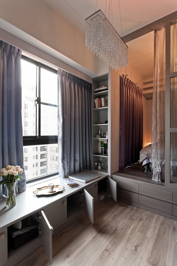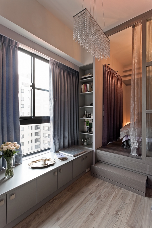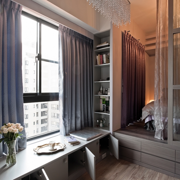 客廳窗前的休閒區,除了可以居高眺望窗外景致,檯面下方更是實用的收納空間。