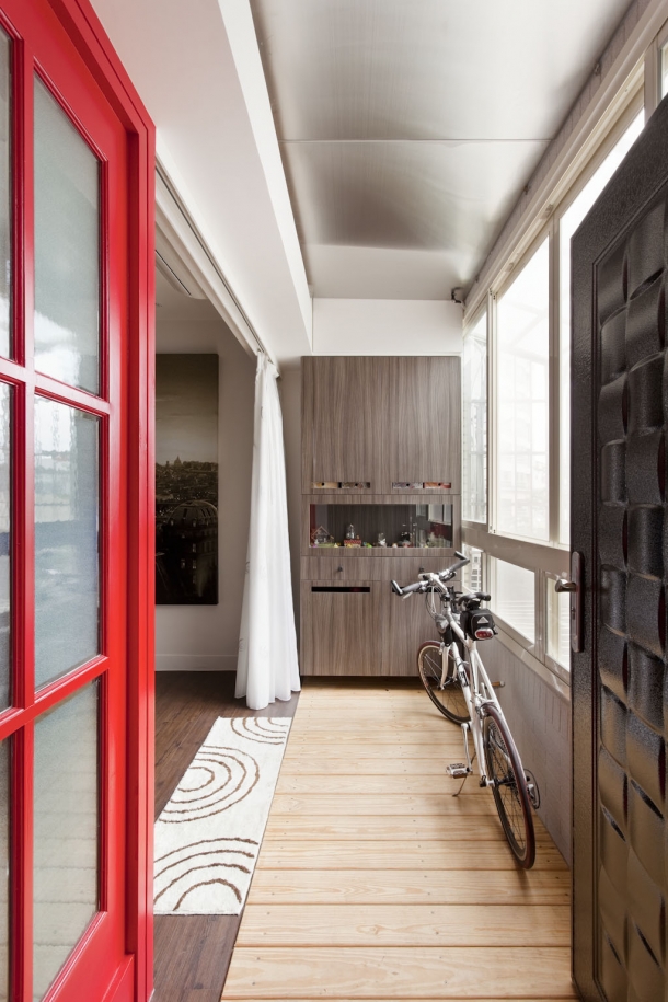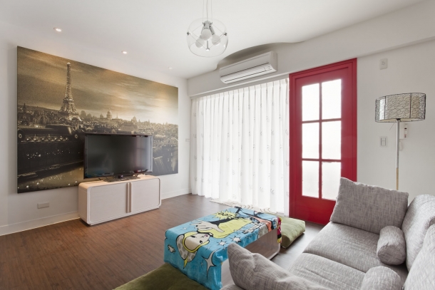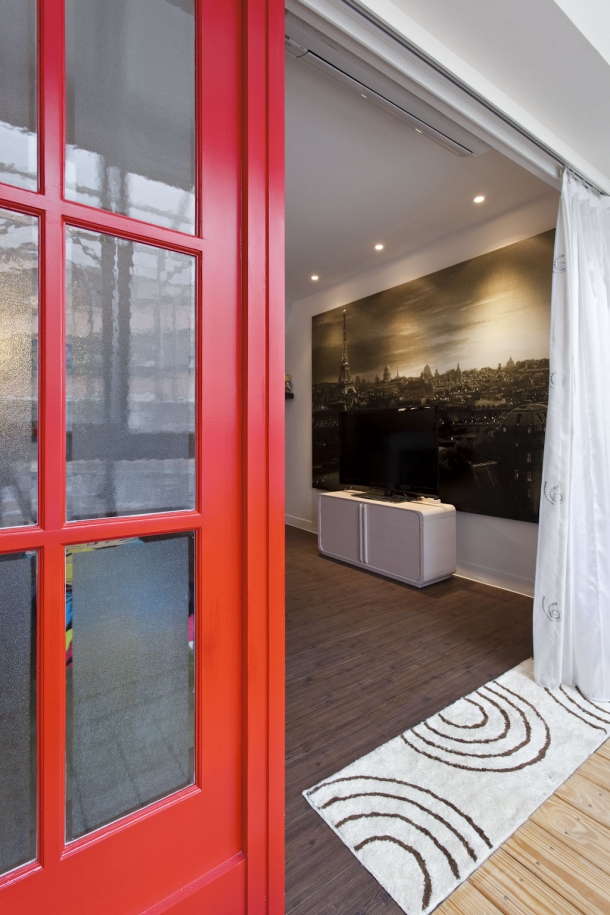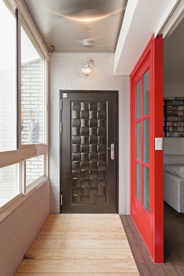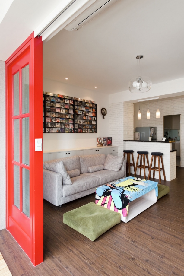 玄關與客廳之間除了固定的紅色玻璃隔屏,也搭配靈活輕巧的拉簾協助界定。