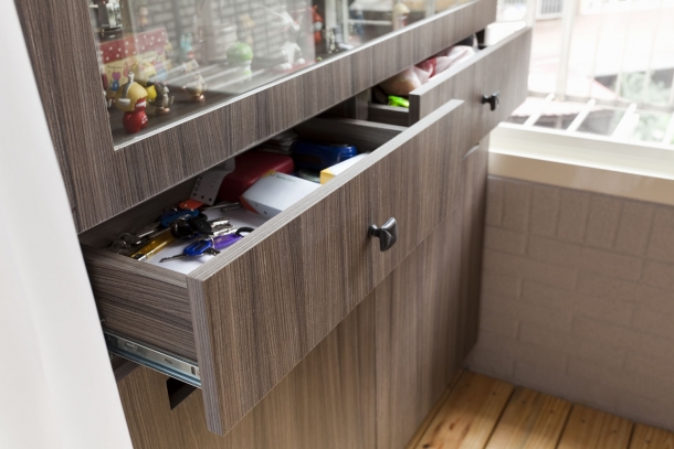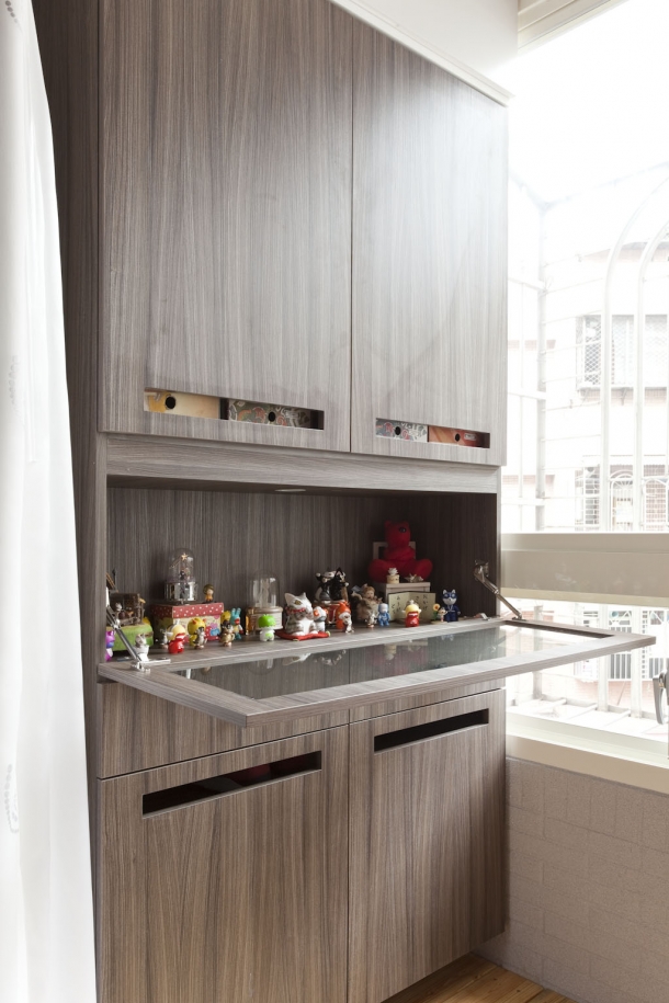 玄關正對大門的動線端點,規劃一座造型簡潔的多功能收納櫃,腰間裝上玻璃門板,成為別緻的小物、公仔展示區,上下櫃則均勻分配一般收納與拉抽機能。